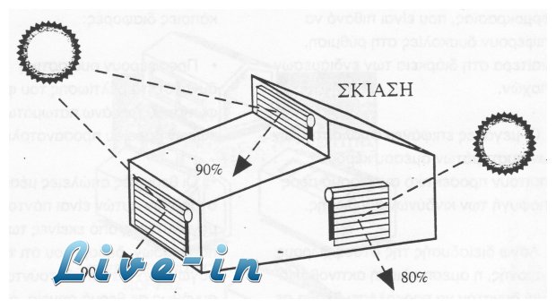 Το καλοκαίρι ο ήλιος κινείται ψηλά στο στερÎωμα. Οι μικρÎς οριζÏŒντιες προεξοχÎς (εξÏŽστες, στÎγες, πÎργκολες) στη νÏŒτια πλευρά μποροÏν να σχεδιαστοÏν Îτσι ÏŽστε να σκιάσουν εντελÏŽς τη νÏŒτια ÏŒψη και τα νÏŒτια ανοίγματα του κτιρίου. Στην ανατολική και τη δυτική πλευρά η ηλιοπροστασία μπορεί να επιτευχθεί με κατακÏŒρυφα σκίαστρα τοποθετημÎνα παράλληλα προς την ανατολική και τη δυτική ÏŒψη. ΤÎτοια σκίαστρα είναι οι κατακÏŒρυφες τÎντες, τα στοράκια, οι εξωτερικÎς κουρτίνες, δικτυωτά με αναρριχÏŽμενα ή και συστάδες δÎνδρων. ÎŒταν τα ανατολικά και δυτικά σκίαστρα απÎχουν απÏŒ τους τοίχους του κτιρίου, δημιουργείται ανάμεσα σ' αυτÏŒ και στο κτίριο Îνας σκιερÏŒς αεριζÏŒμενος χÏŽρος που κάνει την ηλιοπροστασία πολÏ αποτελεσματικÏŒτερη.