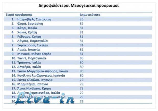 ΠρÏŽτος προορισμÏŒς και με διαφορά (δημοτικÏŒτητα 85) είναι το Ημεροβίγλι της Σαντορίνης, ενÏŽ στη δεÏτερη θÎση θÎση είναι τα Φηρά Σαντορίνης. Η φυσική ομορφιά του νησιοÏ φαίνεται ÏŒτι Îπεισε και αυτÏŒ το καλοκαίρι τους ταξιδιÏŽτες και της χαρίζουν τις δυο πρÏŽτες θÎσεις στις προτιμήσεις τους. Στην τρίτη θÎση είναι το Κάπρι της Ιταλίας με πολÏ μικρή διαφορά απÏŒ τα Χανιά που καταλαμβάνουν την τÎταρτη. Τη χρυσή πεντάδα συμπληρÏŽνει το ΡÎθυμνο με δημοτικÏŒτητα 81, ενÏŽ στη θÎση 17 συνταντάμε και τον Άγιο ΝικÏŒλαο Κρήτης. Η Κρήτη και η Σαντορίνη, σÏμφωνα με τη λίστα, είναι τα δυο νησιά που Îρχονται στο μυαλÏŒ των ταξιδιωτÏŽν στο άκουσμα της ΛÎξης Μεσογείου. Τη λίστα συμπληρÏŽνουν Îξι προορισμοί απÏŒ την Ιταλία, με το Κάπρι να κατακτά την τρίτη θÎση στη λίστα, τÎσσερις προορισμοί απÏŒ την Ισπανία, δυο απÏŒ τη Γαλλία και το Λάγκος της Πορτογαλίας.
