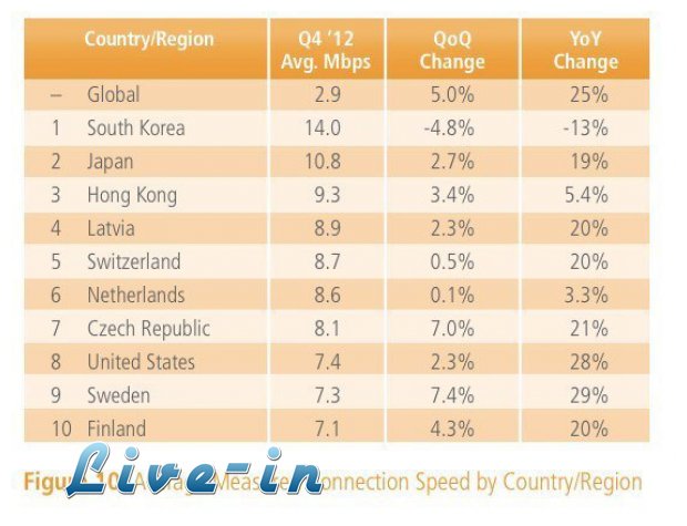 Μια νÎα Îρευνα που είδε το φως της δημοσιÏŒτητας, περιγράφει τις 10 χÏŽρες με τη γρηγορÏŒτερη σÏνδεση στο Ιντερνετ. ΣÏμφωνα με την Îρευνα της Akamai Technologies, το πιο γρήγορο Internet στον κÏŒσμο απολαμβάνουν οι πολίτες της ΝÏŒτιας ΚορÎας, με μÎση σÏνδεση στο Διαδίκτυο στα 14,2 Mbps. Ακολουθεί η Ιαπωνία με 11,7 Mbps και Îπονται Χονγκ ΚÏŒνγκ και Ελβετία με 10,9 και 10,1 Mbps αντίστοιχα. Οι ΗνωμÎνες Πολιτείες βρίσκονται στην Îνατη θÎση, με μÎση σÏνδεση στα 8,6 Mbps και τη δεκάδα κλείνει η Δανία με 8,2 Mbps.