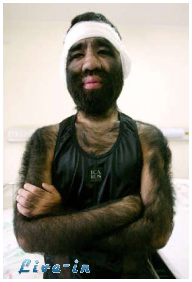 Εξαιτίας μίας σπάνιας πάθησης το 96% της επιφάνειας του κορμιοÏ είναι τριχωτÏŒ και μÏŒνο οι πατοÏσες και οι παλάμες του παραμÎνουν άτριχες.