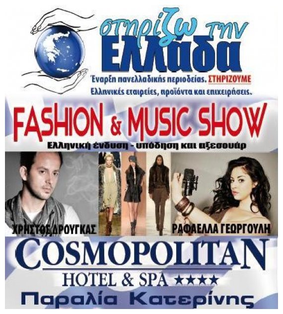 Η Îκθεση θα πραγματοποιηθεί στον αÏλειο χÏŽρο του Ξενοδοχείου «COSMOPOLITAN HOTEL & SPA» στην Παραλία Κατερίνης με πρωτοποριακή επίδειξη ΜÏŒδας. FASHION & MUSIC SHOW. Την επίδειξη μÏŒδας συνοδεÏουν οι καλλιτÎχνες : Χρήστος ΔροÏγκας & ΡαφαÎλα ΓεωργοÏλη. Η ÏŽρα προσÎλευσης είναι 8:00 μ.μ., Η ÏŽρα Îναρξης 8:30μ.μ. Η Είσοδος για το κοινÏŒ είναι ΕλεÏθερη.