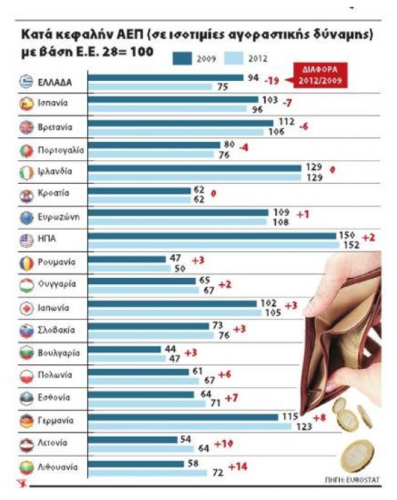 Έτσι, ξεκινÏŽντας με το κατά κεφαλήν ΑΕΠ σε ισοτιμίες αγοραστικής δÏναμης διαπιστÏŽνουμε πως η Ελλάδα είχε το 2012 την 8η χειρÏŒτερη επίδοση στην Ε.Ε. 28 κι ενÏŽ το 2009 το βιοτικÏŒ της επίπεδο ήταν 14% χαμηλÏŒτερο απÏŒ αυτÏŒ της ΕυρωζÏŽνης, το 2012 Îφθασε να είναι 31% χαμηλÏŒτερο!