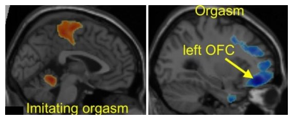 ΠαλαιÏŒτερες μελÎτες Îχουν υποδείξει την περιοχή του εγκεφάλου που ελÎγχει τον oργασμÏŒ. Στα αριστερά, παρουσιάζεται η εγκεφαλική διÎγερση στο συνειδητÏŒ τμήμα του εγκεφάλου (με πορτοκαλί χρÏŽμα). Στα δεξιά, παρουσιάζεται η εγκεφαλική λειτουργία της στιγμή του oργασμοÏ (με μπλε χρÏŽμα), με απενεργοποίηση των κÎντρων του φÏŒβου και των συναισθημάτων.