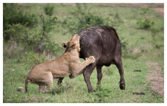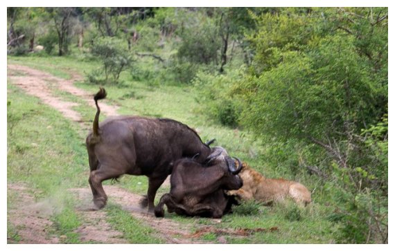 Το λιοντάρι Îχει αρχίσει να κατασπαράζει το άτυχο ζÏŽο και ÏŒλα φαίνεται να συνηγοροÏν πως το τÎλος του βουβαλιοÏ Îφτασε και πως πολÏ σÏντομα θα τελείωνε η ζωή του.