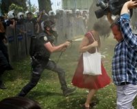 Ο αστυνομικÏŒς απίστευτο θράσος ψεκάζει την δÏστυχη κοπÎλα στα μοÏτρα. Στην φωτογραφία βλÎπετε τον αστυνομικÏŒ με την μάνικα στο χÎρι να ψεκάζει το επικίνδυνο υγρÏŒ σε ÏŒλο το κορμί της γυναίκας. Η εξουσία θÎλει την ηρεμία, και ÏŒχι διαδηλÏŽσεις.